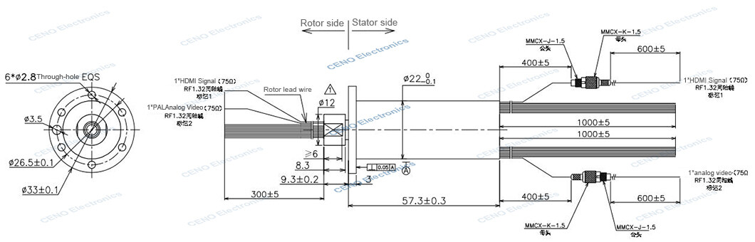 ACN022-30P-01EM is CENO’s new design capsule slip ring with 1circuit HDMI, 1circuit Ethernet,1group RS422 and others electrical signals. The capsule HDMI slip ring is designed and applied to the low temperature environment from -40°C~+60°C. It’s support video standards up to 2K@90Hz and no flash screen no frame loss phenomenon. Often applied to the VR application, Infrared photography, photoelectric pod or Radar communication. For more information about how CENO’s slip ring can fit your specific applications, please contact us.