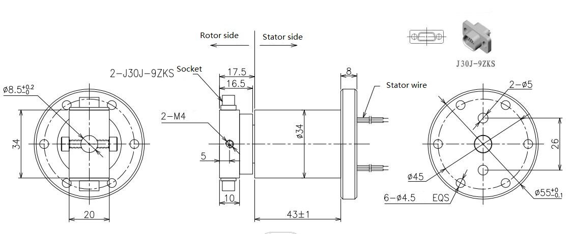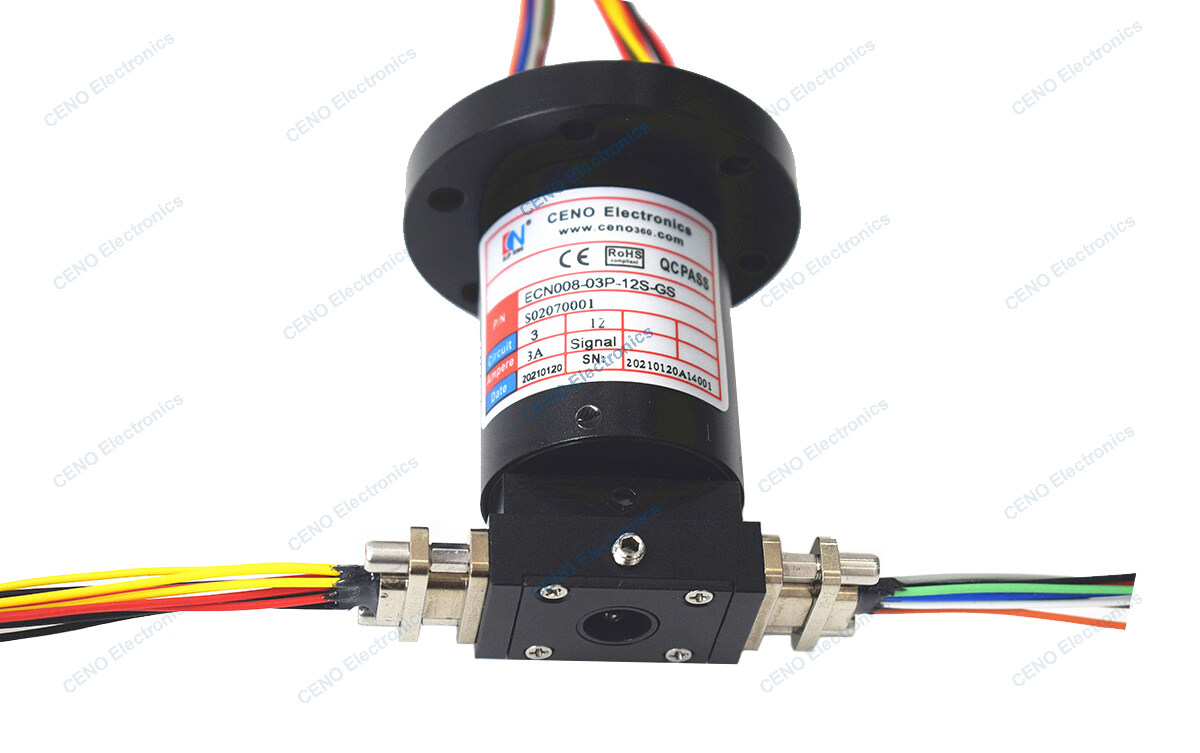 CENO high speed slip ring usually to be applied for testing purpose. Long life of this kind of high speed slip ring is the critical parameter, and it is the design point. CENO provides different high speed design solution, speed up to 10000rpm. ECN008-03P-12S-GS used for aeronautical applications, can working at -40 °C~ +80°C temperature range with operating speed 2000rpm. The high speed slip rings are suitable for high frequency and high data rate transmission and able to endure in hostile environments or at high speed and more. The center hole in the middle of the slip ring is designed to provide clearance for the rotating shaft and rotary joint to meet the function of 360 °rotation of the equipment. CENO slip rings are designed with consideration for all user experiences from ease of installation, ease of maintenance and optimal product life.