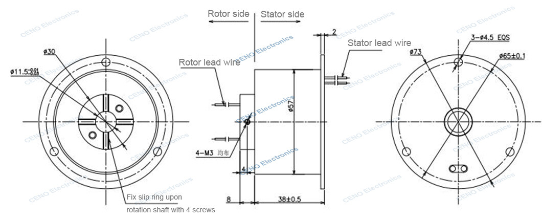 ECN011-04S-GS is CENO’s new design T-type thermocouple hollow shaft slip ring with high speed up to 10000rpm for high speed detection equipment. It features the low torque, low consumption, high stable performance and long service life. For it’s compact structure, small and light weight always applied to the automatic machine, test facilities and instruments, high-speed train detect equipment. For more information about how CENO’s slip ring can fit your specific operation environments, please contact us any time.