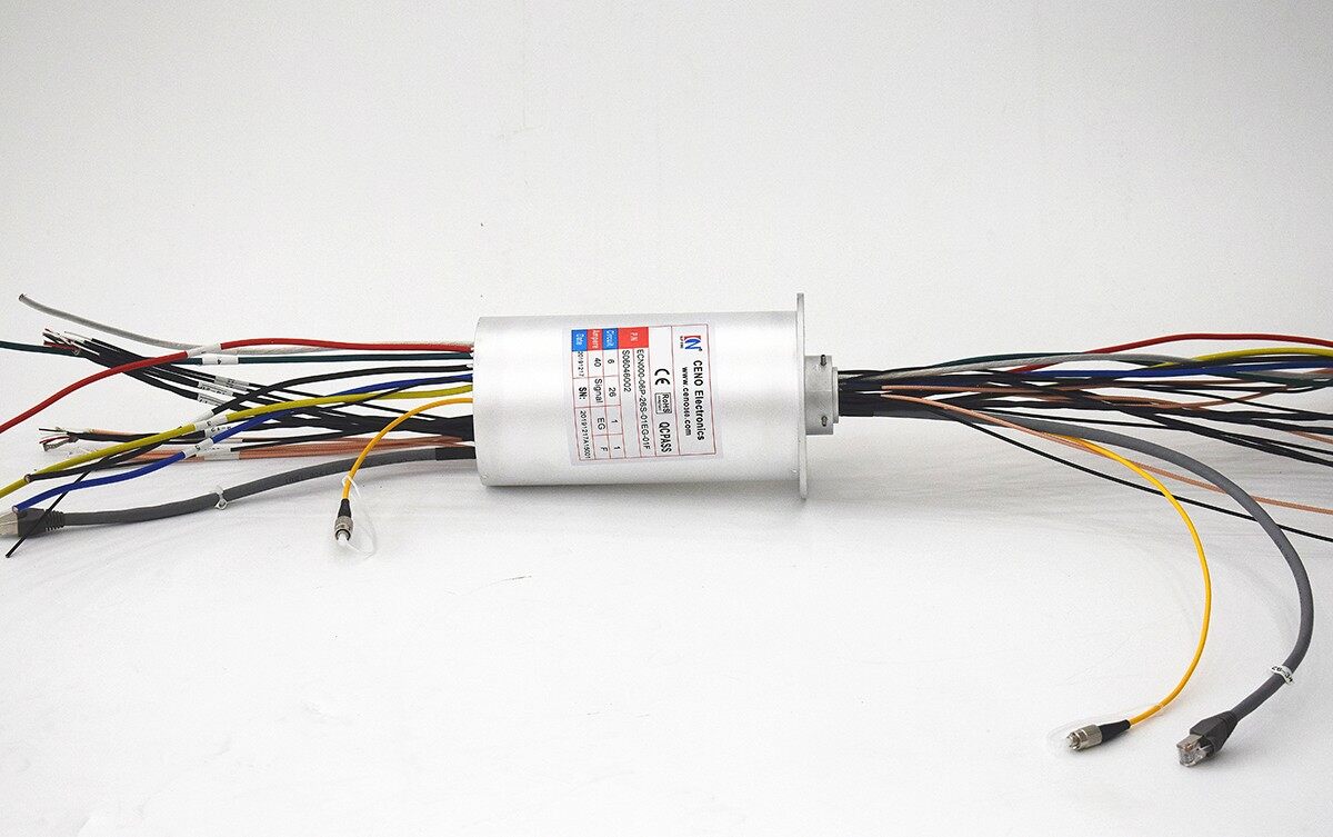 This is hybrid rotary joint, it consists of power part, signal part, Gigabit Ethernet signal and fiber optical. obviously, one fiber optical single mode channel with low insertion loss but high return loss. one channel Gigabit Ethernet signal combine power channels, stable transmission, no package loss, no cross talk, low loss, reliable performance. For the shape structure, we can see housing material is aluminum alloy with solid shaft structure.