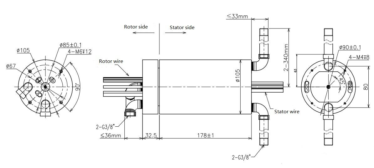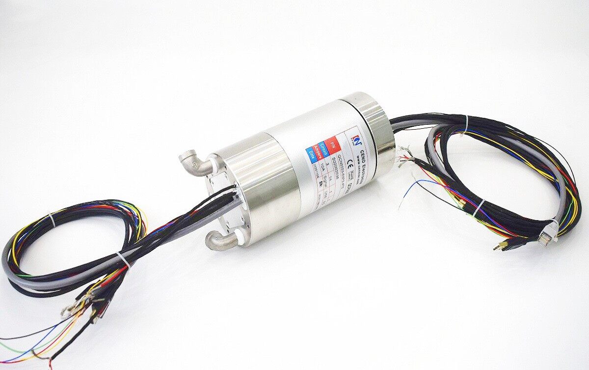 This is a integrated slip ring with 3 rings 10A, 5 rings normal signal, 1 group RS422, 1 group RS232, 1 group USB2.0, 1 group 1000M Ethernet and 1 group HDMI. with 2 channels for liquid, the inner center hole can pass through the drive shaft, gas-liquid passage, it can also integrate high frequency, fiber, encoder, wave guide, gas and liquid and other joints. Slip rings can be used in any electromechanical system that requires unrestrained, continuous rotation while transferring power or data from a stationary to a rotating structure.