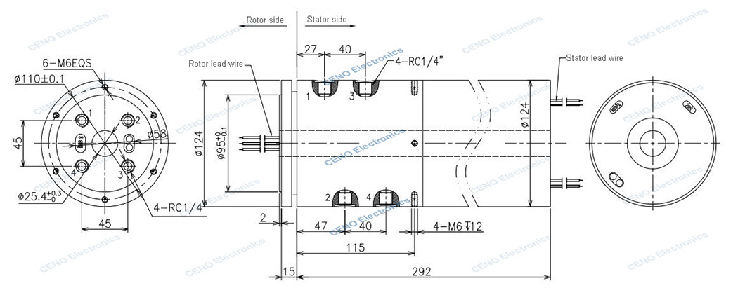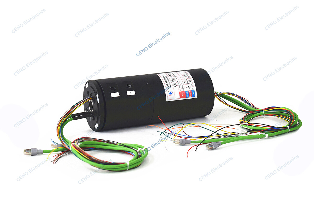 QCN0402-25-04P2-10S-02EG-IP64 is a Integrated Slip Ring that combined Pneumatic Rotary Union with through hole and gigabit Ethernet signal for industry application from CENO Electronics. Due to It’s specific structure and function design, it can be called Ethernet slip ring, pneumatic slip ring and through hole slip ring also. There are 4 circuits for electric power, 10 circuits for IO Signal, 2 circuits for 1000M Gigabit Ethernet and 2 channels for air, and most parameters can be optional as specific environment. For more information about how CENO’s slip ring can fit your specific application, please contact us freely.