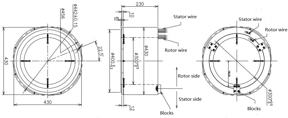 This is a large hollow shaft slip ring with 300mm inner bore size, the through hole size can be optional according to different requests. Housing material is aluminium alloy & stainless steel, contacts material is copper graphite, it’s different from the normal power slip ring with more stable transmission and long life time. Three blocks connect rotor and stator for avoiding slip ring rotate during break time. The damage prone components of the new unit adopt scientific modular design, which allows ease of taking apart or installation without requiring disassembling its housing, quick and convenient replacement of internal parts is conducive to prolonging its service life.
