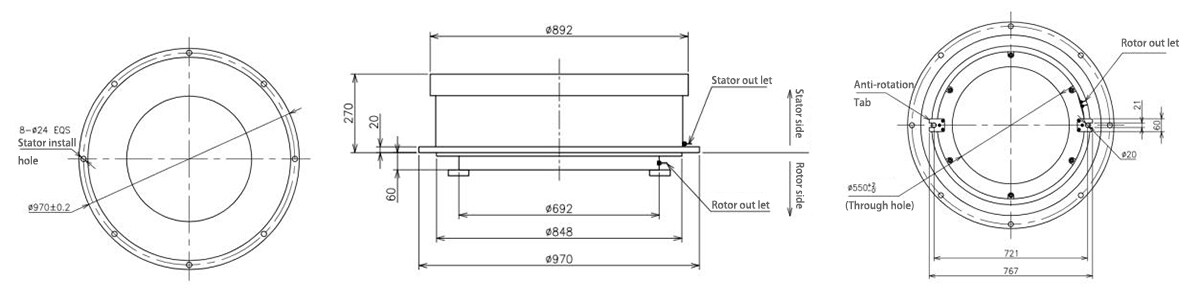 ECN-C-550-06P3 is one of the carbon brush slip rings in CENO company, due to it’s features and specification it can be named Large size slip ring too. It has 6 circuits *15A current with 380VAC. Contact material is copper graphite and the lid of housing material is aluminum and the housing body material is stainless steel. The rotor side electrical brush rotating and the loop in stator side is stationary, both rotor side and stator side are fixed by the bolts with scheduled maintenance. The inner diameter of this large size slip ring is Ø550mm and it can be working stably within the temperature from -30℃ to 80℃, the operating humidity exceed 60%RH. ECN-C-550-06P3 large size slip ring from CENO is mainly used on large material transfer equipment, sewage treatment, and food automation etc.
