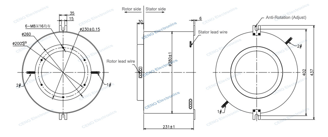 ECN200-04P-12P2-A is CENO Large diameter water proof slip rings with IP65 & through bore ID200mm for high humidity environment. The unobstructed bore through the center provides routing space for concentric shaft mount. CENO through-bore slip rings feature fiber brush technology which offers many advantages than conventional slip ring technology including multiple points of contact force per fiber and low contact wear rates. For more information please contact us.