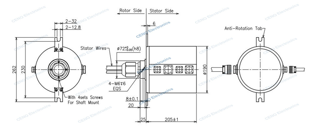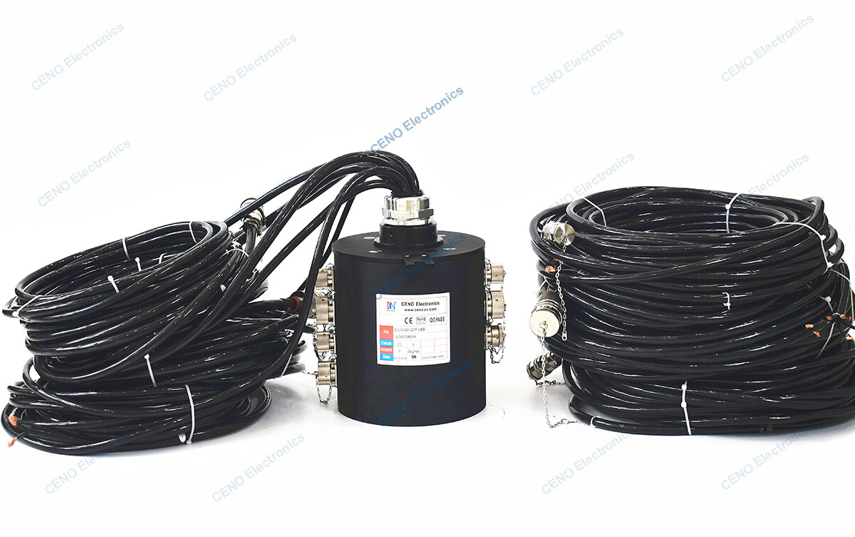 ECN000-22P-05S is low temperature slip ring with Megabit Ethernet signal from CENO Electronics, there are 3 circuits for 13A, 5 circuits for 5A,14 circuits for 14A, 5 circuits for 100M Ethernet signal (Megabit & Gigabit Ethernet signal optional) and one wire PE. It’s working stably at speed of 0~20rpm in temperature of -40°C to +40°C, the external diameter is 190mm and can be customized as different application, due to it’s stable transmission, no packet loss, no loss and ultra-long distance transmission, it’s usually apply to the wire-drawing machine, communication system, turntable test equipment and automatic equipment.