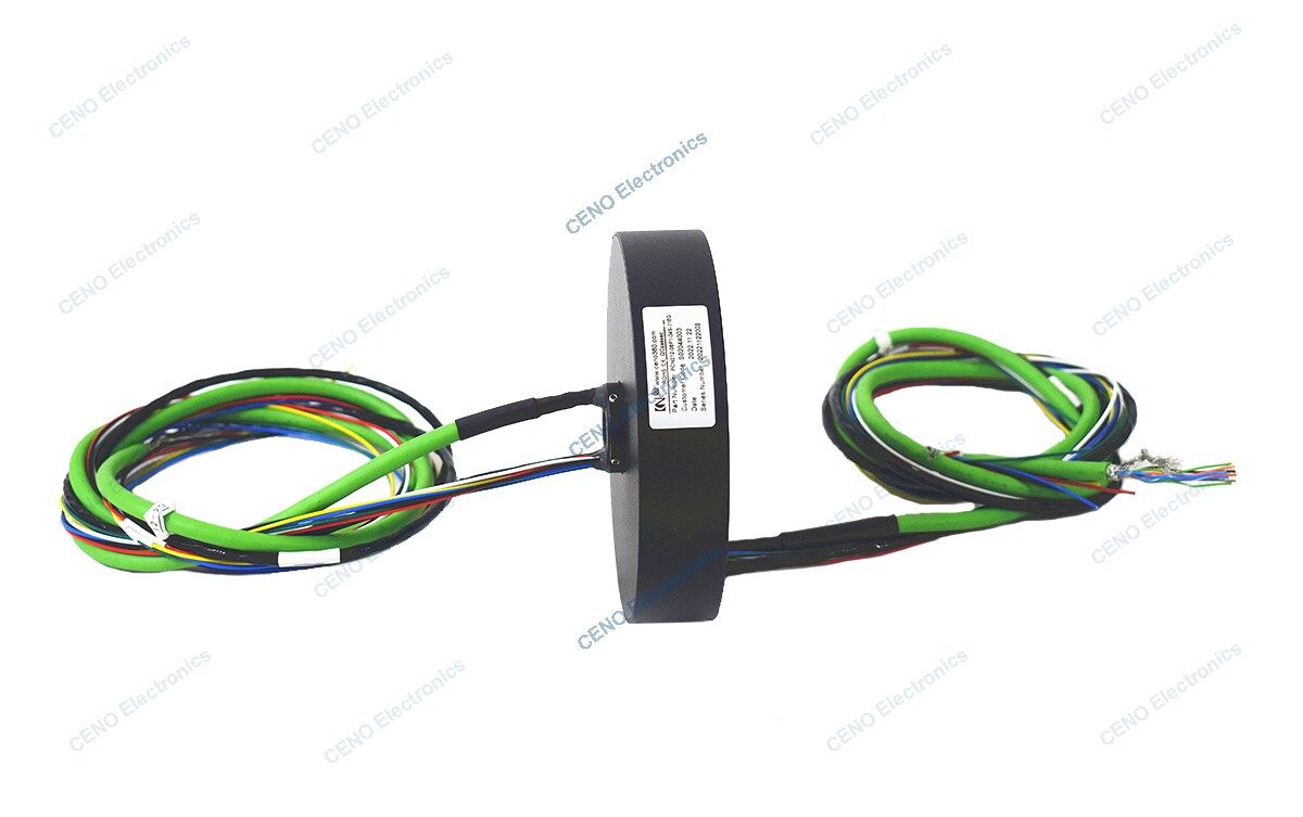 PCN012-06P1-04S-01EG is pancake slip ring with gigabit Ethernet signal for industry application from CENE Electronics, there are6 circuits for 5A electric power, 4 circuits for signal and 1 channel for 1000M Ethernet signal. Pancake slip ring is similar to the through hole slip ring and is specially used for the rotating system without enough height. Also called flat slip ring, flat disc electrical slip ring or platter slip ring. Due to it’s separate components or integrated assemblies and long working life, often apply to the Military equipment, Electric devices, Medical facility and Industrial machinery etc.