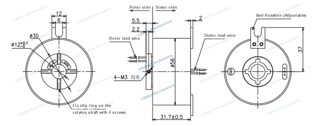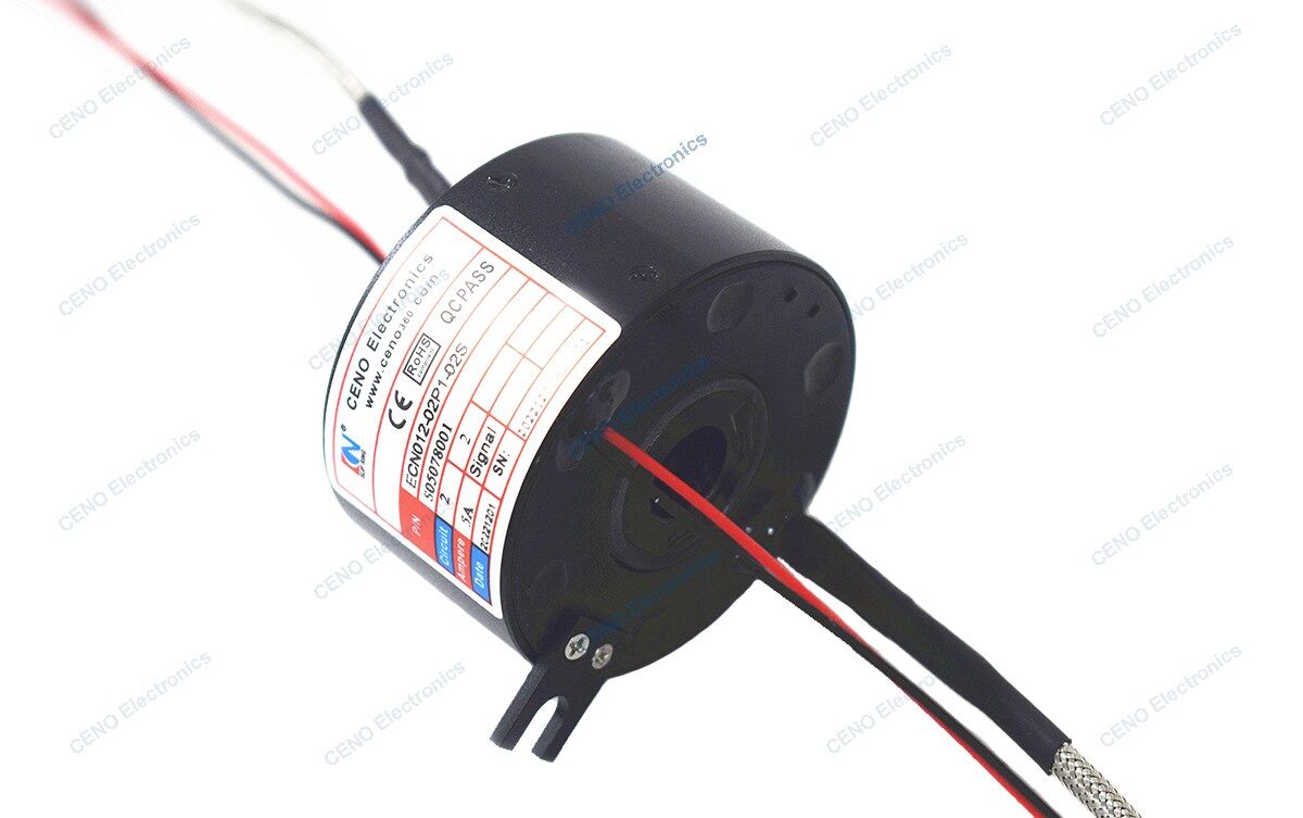 ECN012-02P1-02S is a K-type Therm couple signal slip ring with hollow shaft from CENO Electronics, there are 2 circuits for 5A and 2 circuits for K Therm couple signals. We can provide different solution according to customer’s requirements, inner bore size can be choose from 3mm to 980mm, wide temperature measurement range from -270℃ to +2800℃, high measurement precision and thermal couple type is optional. Mainly applied on chip mounter, automation machinery and agitator in chemical engineering.