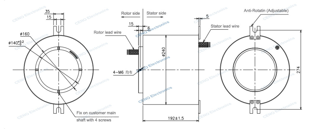 ECN140-20S-IP54 is a K type Thermo couple signal slip ring which is a customized slip ring too. In order to meet the requirement of equipment continuous rotating transmission of thermo couple signals, CENO design and develop a type of high precision slip ring to use and transmit thermo couple signals. Which have been successfully used in rotary furnace equipment, coating machine, heating shaft equipment, welding equipment and automatic turntables, etc. More information please contact us.