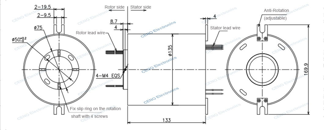 ECN050-18P-IP67 is CENO function water proof slip ring with through hole and inner diameter Ø50mm, which is designed for the environments high humidity , corrosion, even for the under water. The water proof slip ring can be designed to multiple protection grade as the different working environment as IP65, IP66, IP67 and IP68. It’s often applied to the marine engineering, ships, port and navigation equipment. For more information about how CENO slip ring can fit your specific application, please contact us freely.